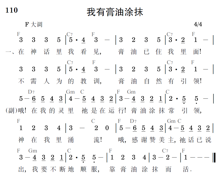 哦!在我的灵里祂是在运行!膏油涂抹常引领,神在我里涌流!哦,感谢赞美主,祂话已说出,我要不断的顺服,靠膏油涂抹而活。