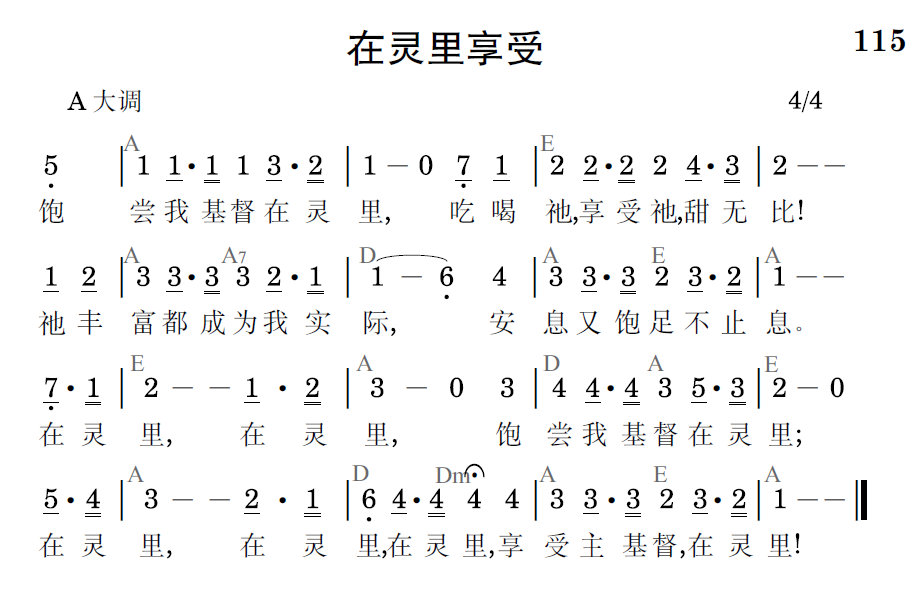饱尝我基督在灵里,吃喝祂,享受祂,甜无比!祂丰富都成为我实际,安息又饱足不止息。在灵里,在灵里,饱尝我基督在灵里;在灵里,在灵里,在灵里,享受主基督,在灵里!