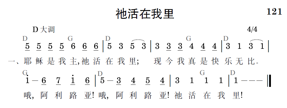 耶稣是我主,祂活在我里;现今我真是快乐无比。哦,阿利路亚!哦,阿利路亚!祂活在我里!