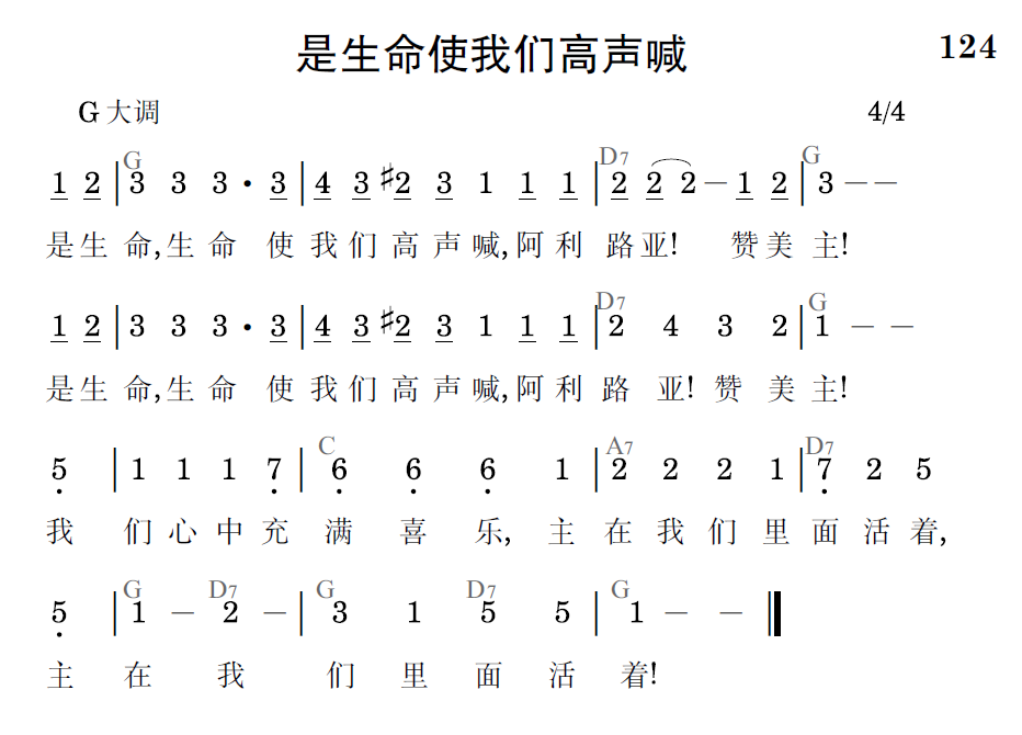 是生命,生命使我们高声喊,阿利路亚!赞美主!是生命,生命,使我们高声喊,阿利路亚!赞美主!我们心中充满喜乐,主在我们里面活着,主在我们里面活着!