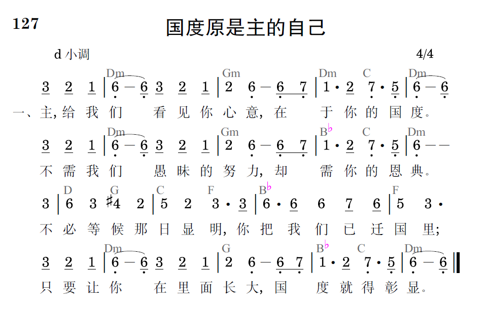 主,给我们看见你心意,在于你的国度。不需我们愚昧的努力,却需你的恩典。不必等候那日显明,你把我们已迁国里;只要让你在里面长大,国度就得彰显。
