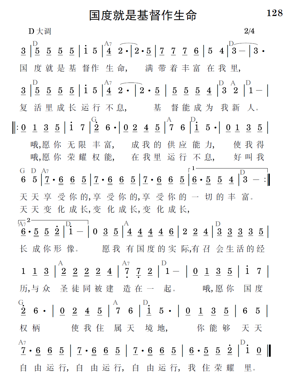 国度就是基督作生命,满带着丰富在我里,复活里成长运行不息,基督能成为我新人。哦,愿你无限丰富,成我的供应能力,使我得天天享受你的,享受你的,享受你的一切的丰富。哦,愿你荣耀权能,在我里运行不息,好叫我天天变化成长,变化成长,变化成长,长成你形像。愿我有国度的实际,有召会生活的经历,与众圣徒同被建造在一起。哦,愿你国度权柄使我住属天境地,你能够天天自由运行,自由运行,自由运行,我住荣耀里。