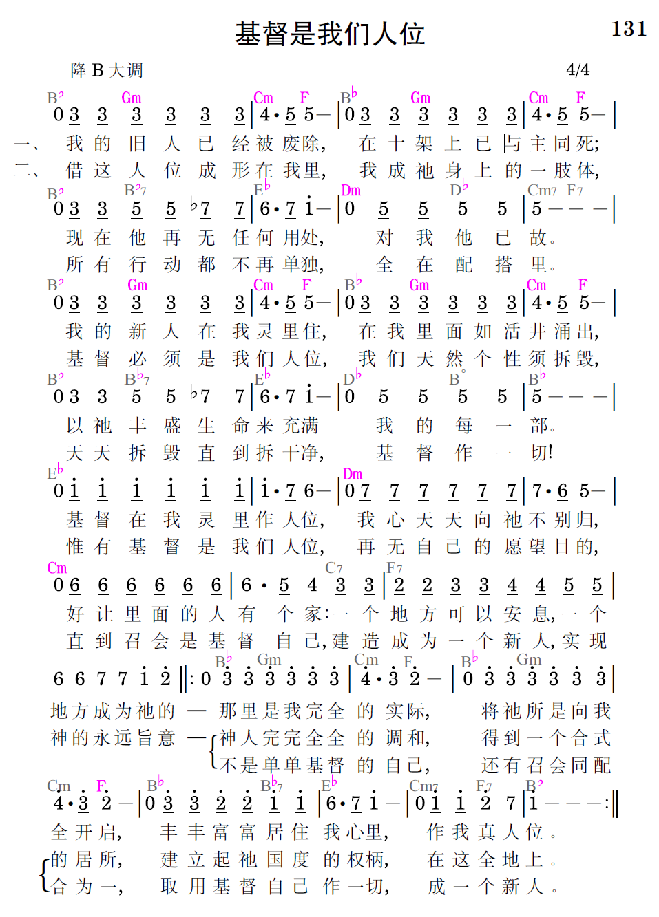 我的旧人已经被废除,在十架上已与主同死;现在他再无任何用处,对我他已故。我的新人在我灵里住,在我里面如活井涌出,以祂丰盛生命来充满我的每一部。基督在我灵里作人位,我心天天向祂不别归,好让里面的人有个家:一个地方可以安息,一个地方成为祂的——那里是我完全的实际,将祂所是向我全开启,丰丰富富居住我心里,作我真人位。