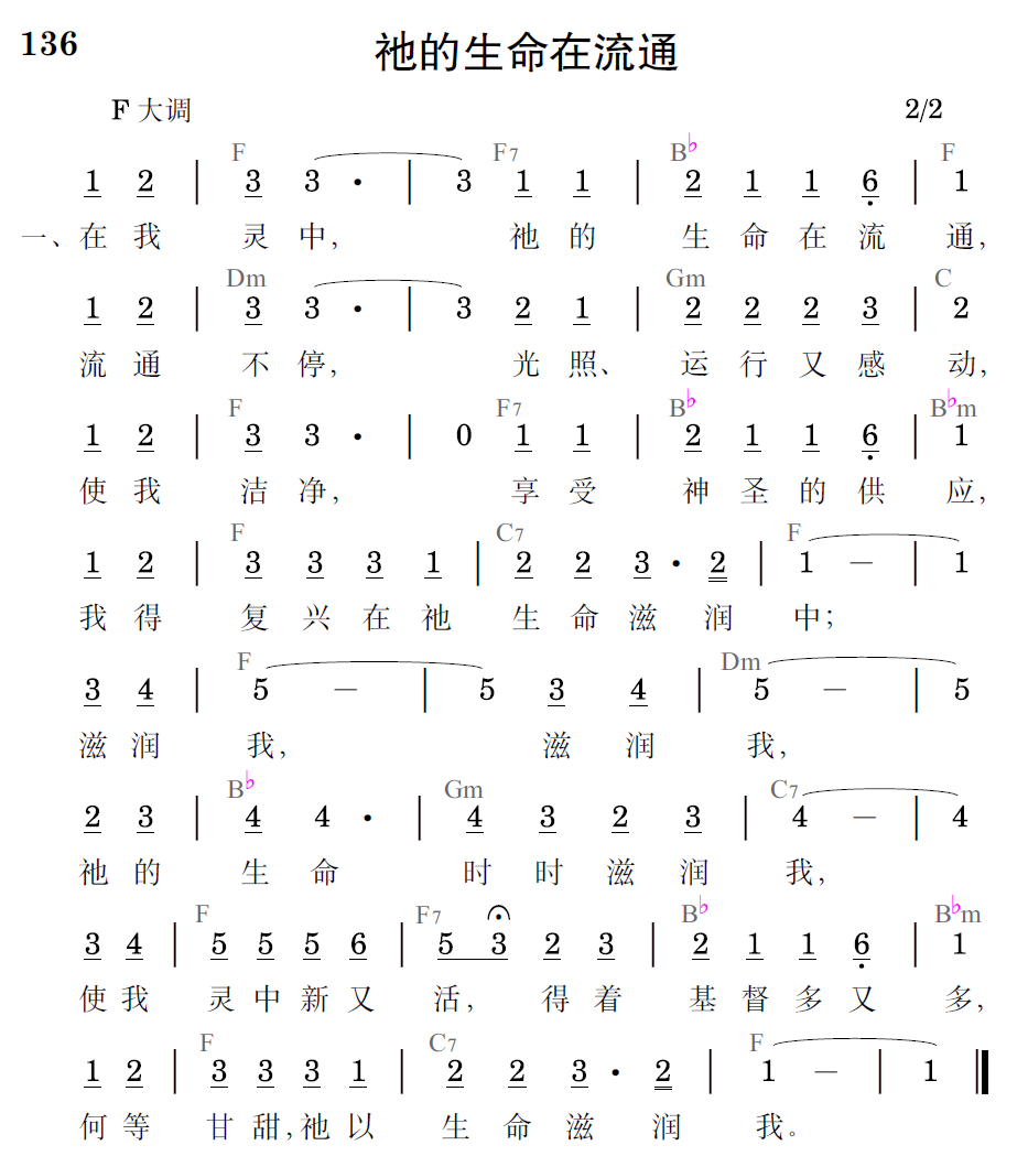 在我灵中,祂的生命在流通,流通不停,光照、运行又感动,使我洁净,享受神圣的供应,我得复兴在祂生命滋润中;滋润我,滋润我,祂的生命时时滋润我,使我灵中新又活,得着基督多又多,何等甘甜,祂以生命滋润我。