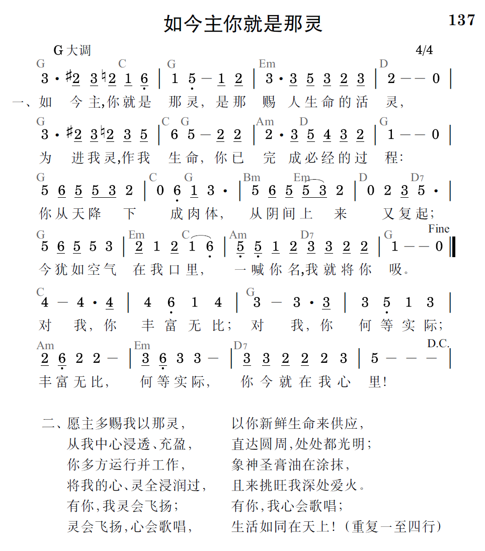 如今主,你就是那灵,是那赐人生命的活灵,为进我灵,作我生命,你已完成必经的过程:你从天降下成肉体,从阴间上来又复起;今犹如空气在我口里,一喊你名,我就将你吸。对我,你丰富无比;对我,你何等实际;丰富无比,何等实际,你今就在我心里!(重复一至四行)