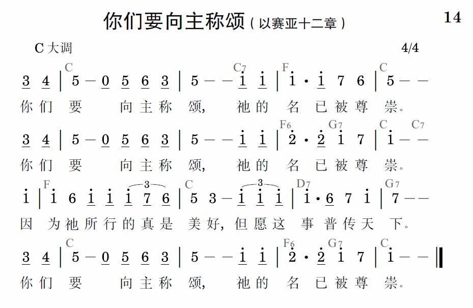 你们要向主称颂,祂的名已被尊崇。你们要向主称颂,祂的名已被尊崇。因为祂所行的真是美好,但愿这事普传天下。你们要向主称颂,祂的名已被尊崇。