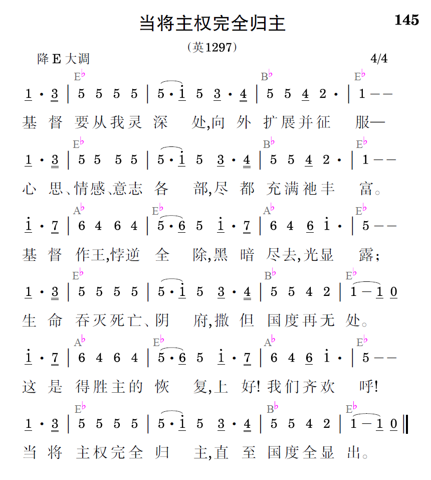 基督要从我灵深处,向外扩展并征服——心思、情感、意志各部,尽都充满祂丰富。基督作王,悖逆全除,黑暗尽去,光显露;生命吞灭死亡、阴府,撒但国度再无处。这是得胜主的恢复,上好!我们齐欢呼!当将主权完全归主,直至国度全显出。