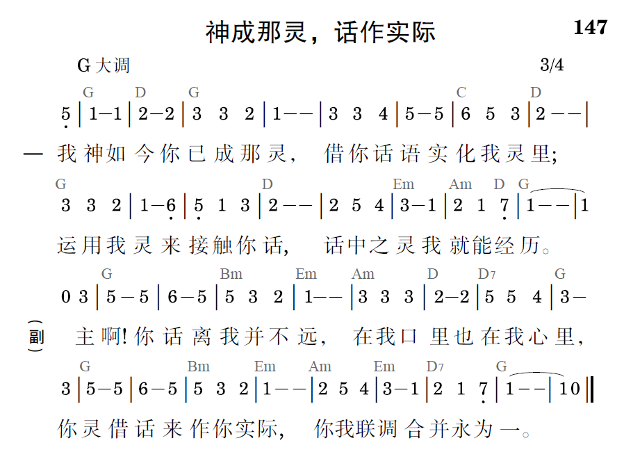 主啊!你话离我并不远,在我口里也在我心里,你灵借话来作你实际,你我联调合并永为一。
