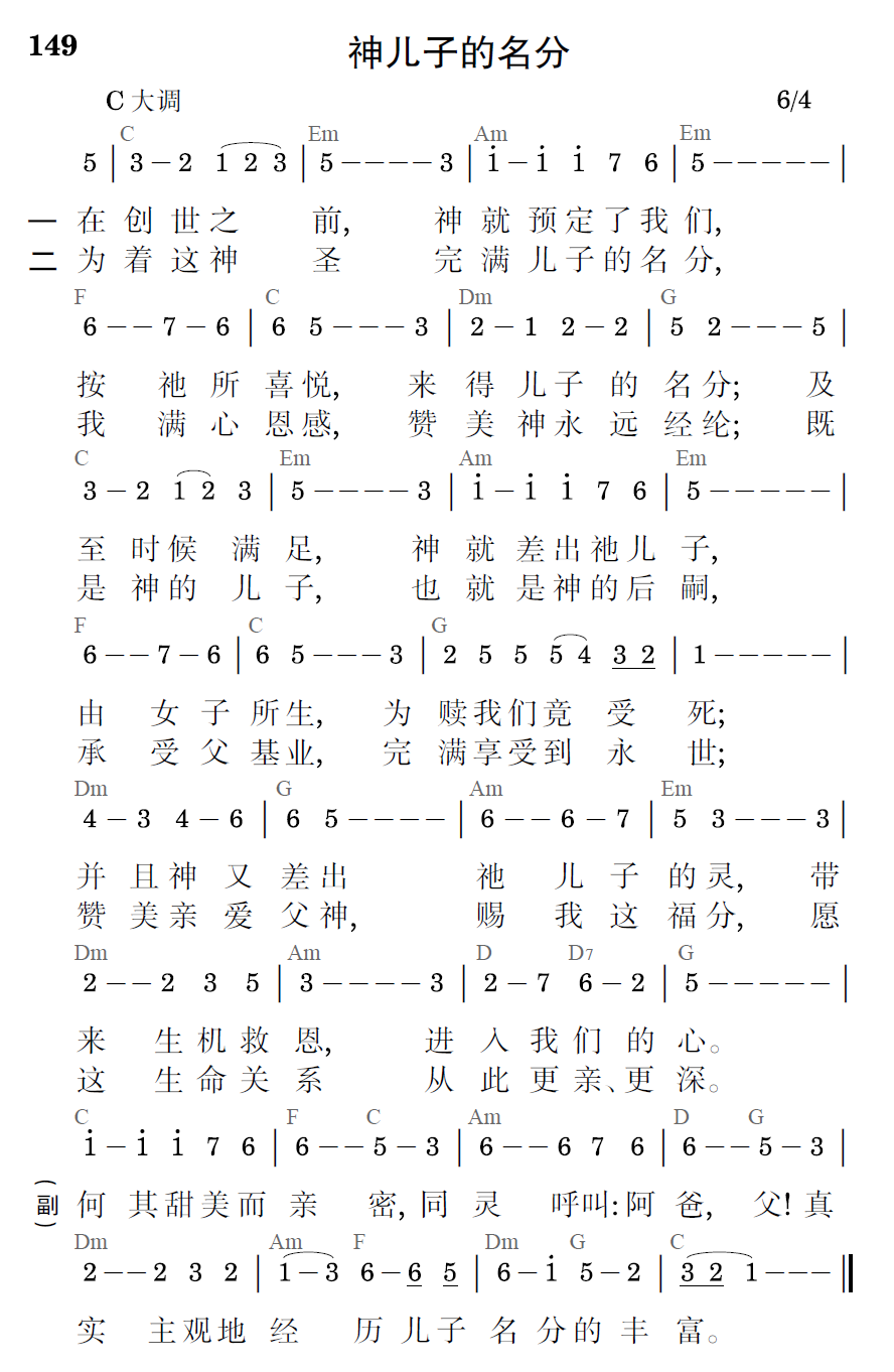 为着这神圣完满儿子的名分,我满心恩感,赞美神永远经纶;既是神的儿子,也就是神的后嗣,承受父基业,完满享受到永世;赞美亲爱父神,赐我这福分,愿这生命关系,从此更亲、更深。