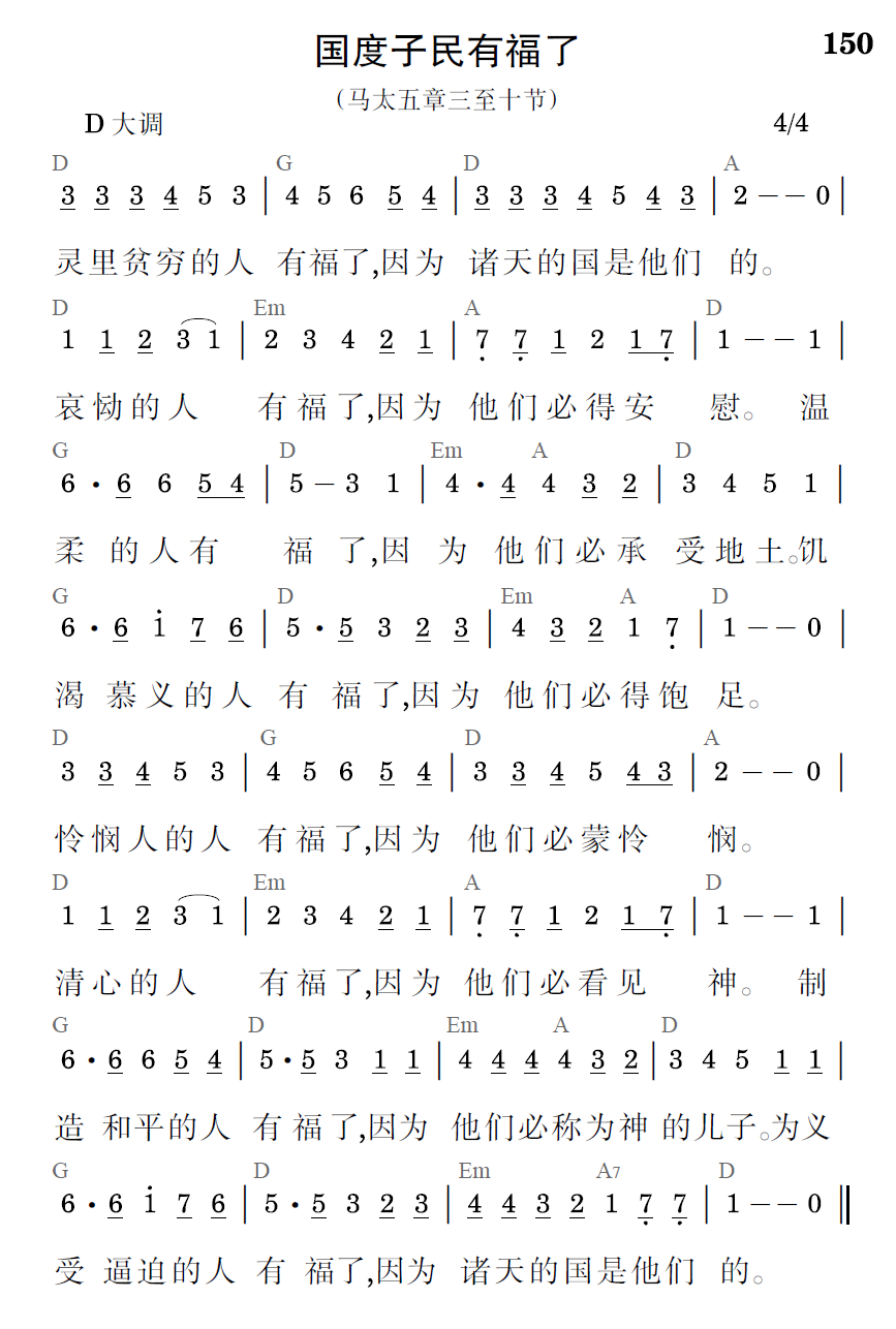 灵里贫穷的人有福了,因为诸天的国是他们的。哀恸的人有福了,因为他们必得安慰。温柔的人有福了,因为他们必承受地土。饥渴慕义的人有福了,因为他们必得饱足。怜悯人的人有福了,因为他们必蒙怜悯。清心的人有福了,因为他们必看见神。制造和平的人有福了,他们必称为神的儿子。为义受逼迫的人有福了,因为诸天的国是他们的。