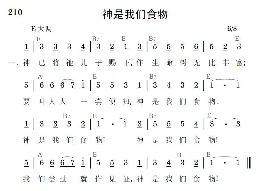 神已将祂儿子赐下,作生命树无比丰富;要叫人人一尝便知,神是我们食物。神是我们食物!神是我们食物!我们尝过就作见证,神是我们食物!