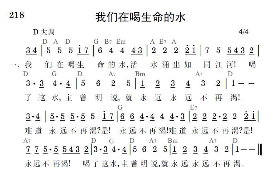 我们在喝生命的水,活水涌出如同江河!喝了这水,主曾明说,就永远永远不再渴!难道永远不再渴?是!永远不再渴!难道永远不再渴?是!永远不再渴!喝了这水,主曾明说,就永远永远不再渴。