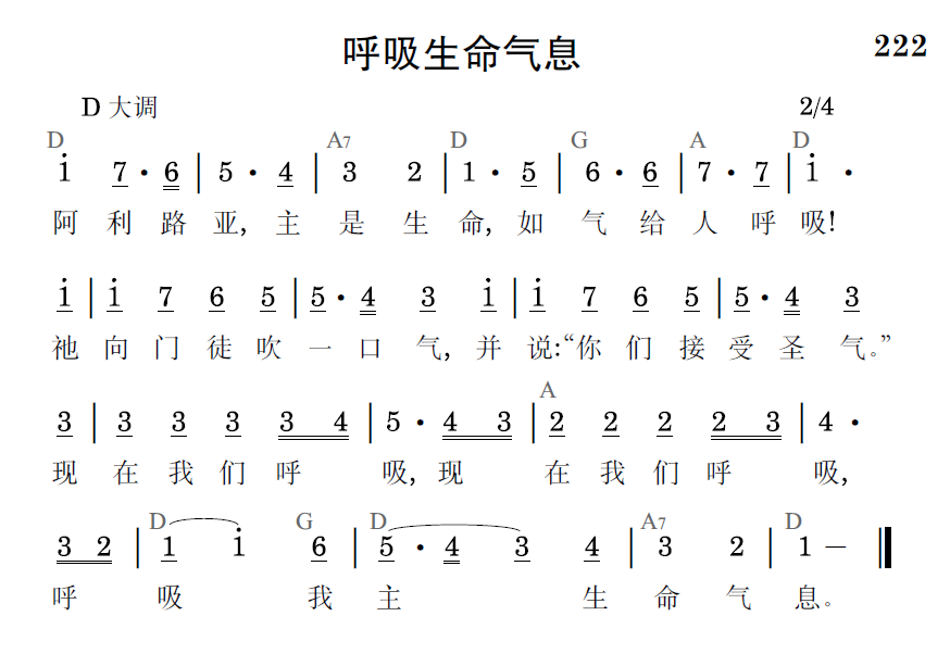阿利路亚,主是生命,如气给人呼吸!祂向门徒吹一口气,并说,“你们接受圣气。”现在我们呼吸,现在我们呼吸,呼吸我主生命气息。
