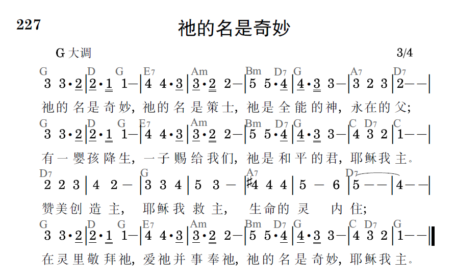 祂的名是奇妙,祂的名是策士,祂是全能的神,永在的父;有一婴孩降生,一子赐给我们,祂是和平的君,耶稣我主。赞美创造主,耶稣我救主,生命的灵内住;在灵里敬拜祂,爱祂并事奉祂,祂的名是奇妙,耶稣我主。