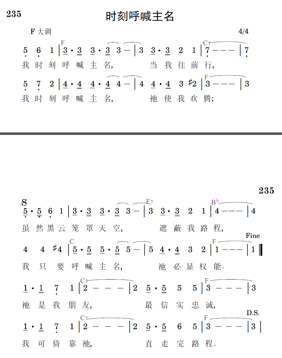 我时刻呼喊主名,当我往前行,我时刻呼喊主名,祂使我欢腾;虽然黑云笼罩天空,遮蔽我路程,我只要呼喊主名,祂必显权能。祂是我朋友,最信实忠诚,我可倚靠祂,直走完路程。我时刻呼喊主名,当我往前行,我时刻呼喊主名,祂使我欢腾;虽然黑云笼罩天空,遮蔽我路程,我只要呼喊主名,祂必显权能。
