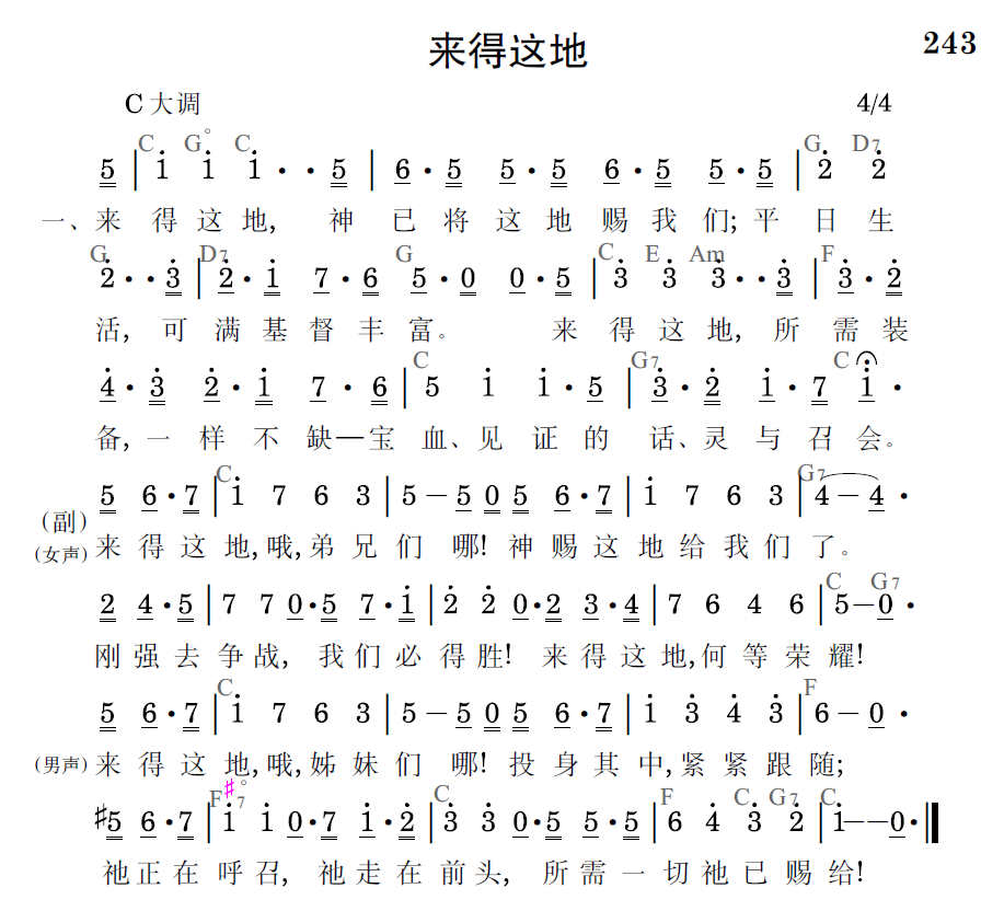 来得这地,神已将这地赐我们;平日生活,可满基督丰富。来得这地,所需装备,一样不缺——宝血、见证的话、灵与召会。