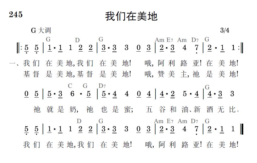 我们在美地,我们在美地!哦,阿利路亚!在美地!基督是美地,基督是美地!哦,赞美主,祂是美地!祂就是奶,祂也是蜜;五谷和油、新酒无比。我们在美地,我们在美地!哦,阿利路亚!在美地!