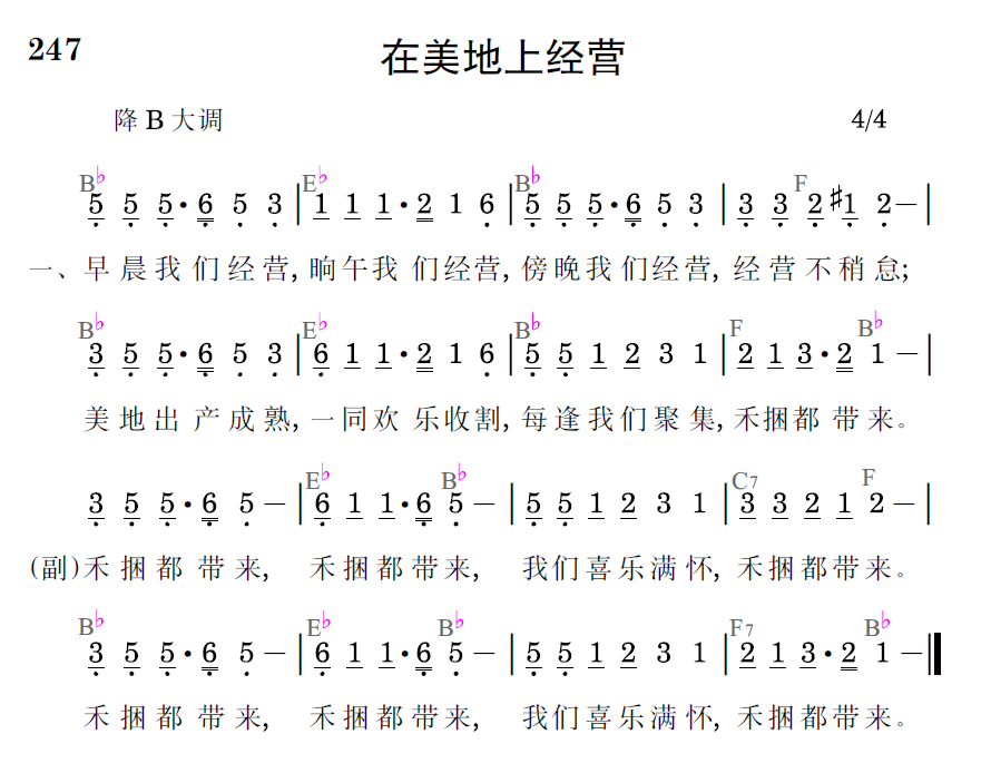 早晨我们经营,晌午我们经营,傍晚我们经营,经营不稍怠;美地出产成熟,一同欢乐收割,每逢我们聚集,禾捆都带来。
