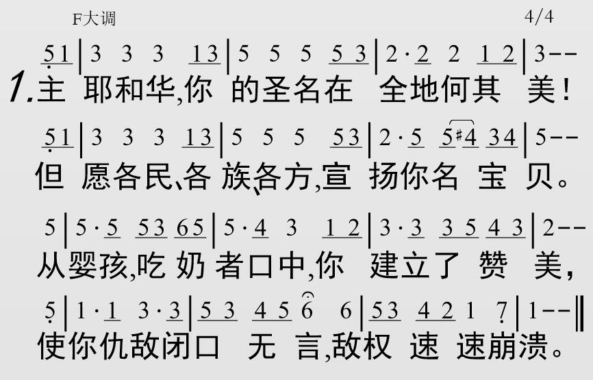 主耶和华,你的圣名在全地何其美!但愿各民、各族、各方,宣扬你名宝贝。从婴孩,吃奶者口中,你建立了赞美,使你仇敌闭口无言,敌权速速崩溃。