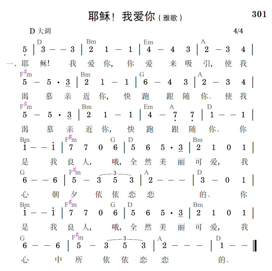 耶稣!我爱你,你爱来吸引,使我渴慕亲近你,快跑跟随你。使我渴慕亲近你,快跑跟随你。你是我良人,哦,全然美丽可爱,我心朝夕依依恋恋的。你是我良人,哦,全然美丽可爱,我心中所依依恋恋的。