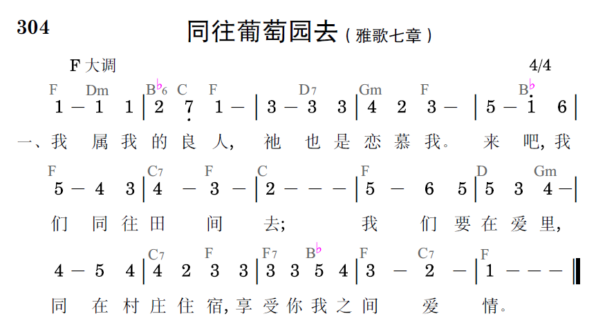 我属我的良人,祂也是恋慕我。来吧,我们同往田间去;我们要在爱里,同在村庄住宿,享受你我之间爱情。