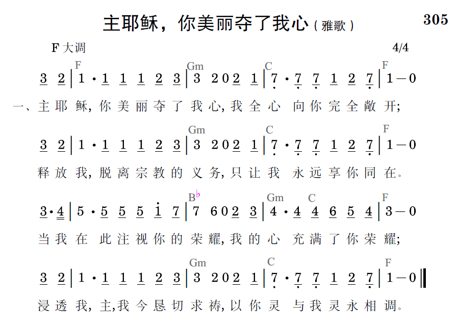 主耶稣,你美丽夺了我心,我全心向你完全敞开;释放我,脱离宗教的义务,只让我永远享你同在。当我在此注视你的荣耀,我的心充满了你荣耀;浸透我,主,我今恳切求祷,以你灵与我灵永相调。