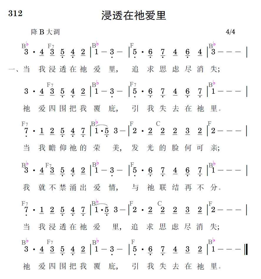 当我浸透在祂爱里,追求思虑尽消失;祂爱四围把我覆庇,引我失去在祂里。当我瞻仰祂的荣美,发光的脸何可亲;我就不禁涌出爱情,与祂联结再不分。当我浸透在祂爱里,追求思虑尽消失;祂爱四围把我覆庇,引我失去在祂里。
