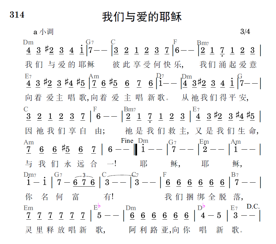 我们与爱的耶稣彼此享受何快乐,我们涌起爱意向着爱主唱歌,向着爱主唱新歌。从祂我们得平安,因祂我们享自由;祂是我们救主,又是我们生命,与我们永远合一!我们与爱的耶稣彼此享受何快乐,我们涌起爱意向着爱主唱歌,向着爱主唱新歌。从祂我们得平安,因祂我们享自由;祂是我们救主,又是我们生命,与我们永远合一!耶稣,耶稣,你名何富有!我们捆绑全脱落,灵里释放唱新歌,阿利路亚向你唱新歌。