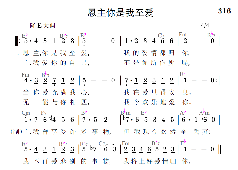 恩主,你是我至爱,我的爱情都归你,当你爱充满我心,我在爱里得安息。主,我爱你的自己,不是你所作所赐,无一能与你相匹,我今欢乐的爱你。