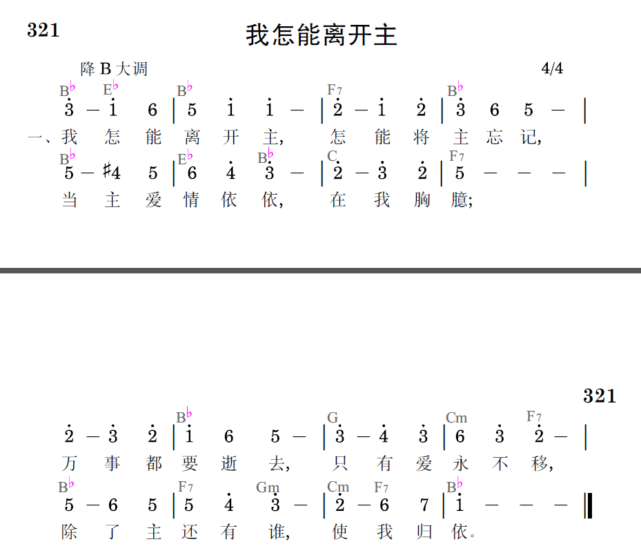 我怎能离开主,怎能将主忘记,当主爱情依依,在我胸臆;万事都要逝去,只有爱永不移,除了主还有谁,使我归依。