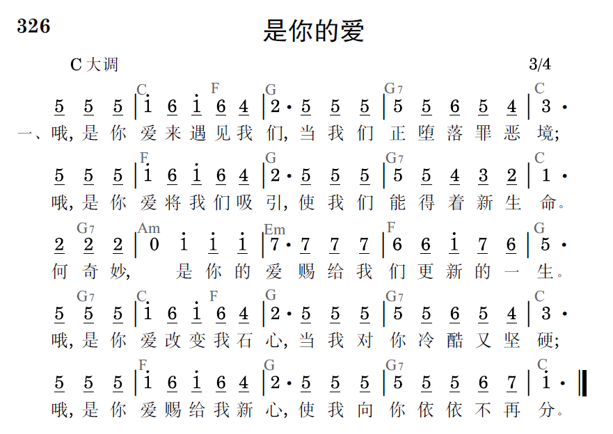 哦,是你爱来遇见我们,当我们正堕落罪恶境;哦,是你爱将我们吸引,使我们能得着新生命。何奇妙,是你的爱赐给我们更新的一生。哦,是你爱改变我石心,当我对你冷酷又坚硬;哦,是你爱赐给我新心,使我向你依依不再分。