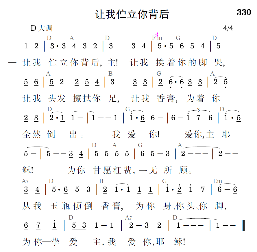 让我伫立你背后,主!让我挨着你的脚哭,让我头发擦拭你足,让我香膏,为着你全然倒出。我爱你!爱你,主耶稣!为你甘愿枉费,一无所顾。从我玉瓶倾倒香膏,为你身、你头、你脚,为你——挚爱主,我爱你,耶稣!