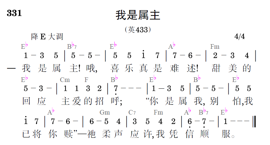 我是属主!哦,喜乐真是难述!甜美的回应主爱的招呼;“你是属我,别怕,我已将你赎”——祂柔声应许,我凭信顺服。