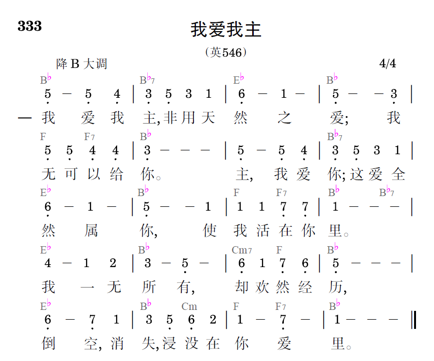 我爱我主,非用天然之爱;我无可以给你。主,我爱你;这爱全然属你,使我活在你里。我一无所有,却欢然经历,倒空,消失,浸没在你爱里。