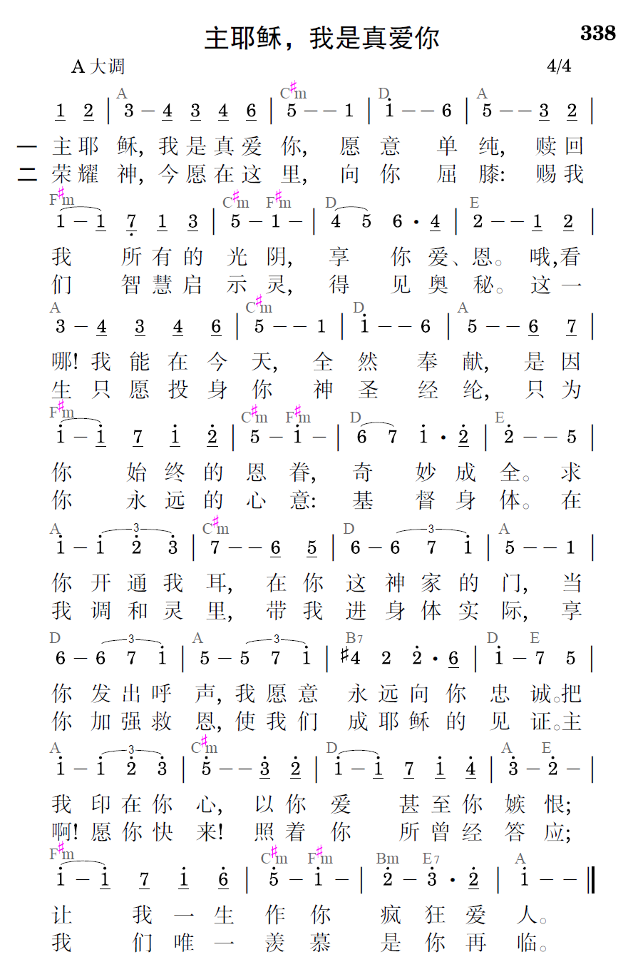 主耶稣,我是真爱你,愿意单纯,赎回我所有的光阴,享你爱、恩。哦,看哪!我能在今天,全然奉献,是因你始终的恩眷,奇妙成全。求你开通我耳,在你这神家的门,当你发出呼声,我愿意向你忠诚。把我印在你心,以你爱甚至你嫉恨;让我一生作你疯狂爱人。