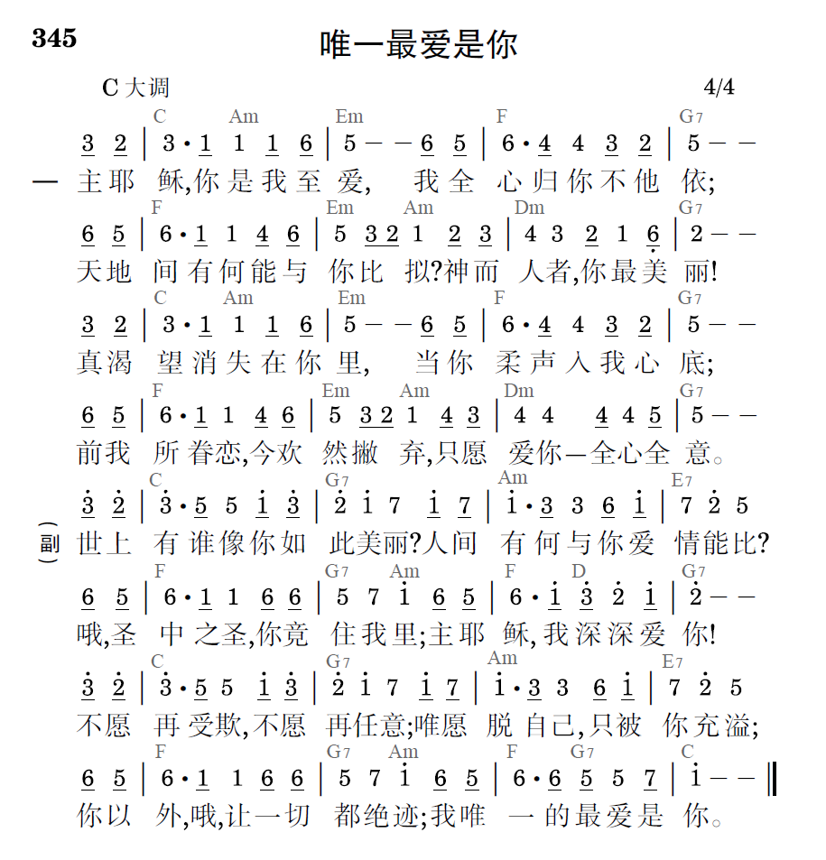 主耶稣,你是我至爱,我全心归你不他依;天地间有何能与你比拟?神而人者,你最美丽!真渴望消失在你里,当你柔声入我心底;前我所眷恋,今欢然撇弃,只愿爱你——全心全意。