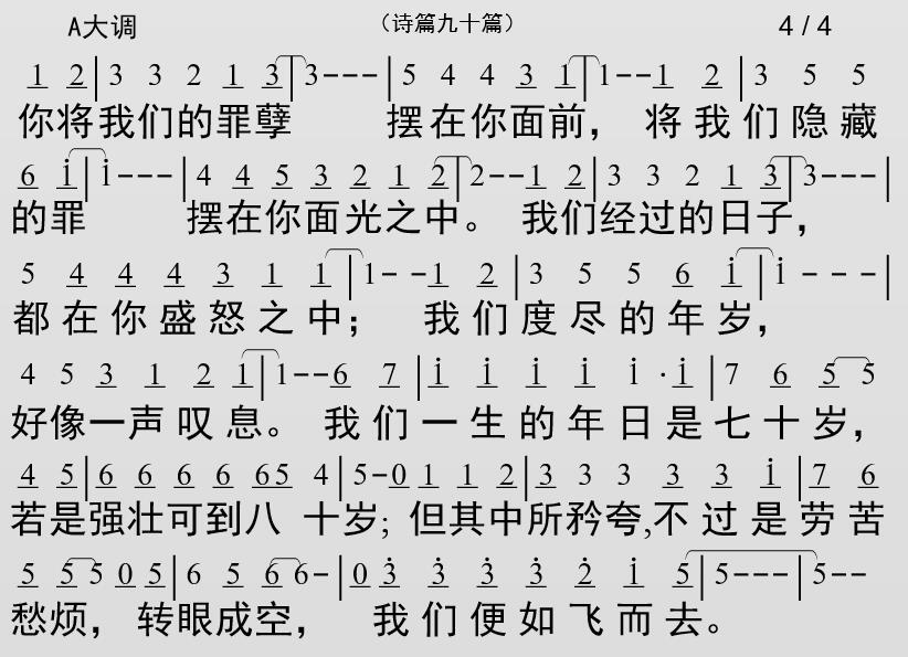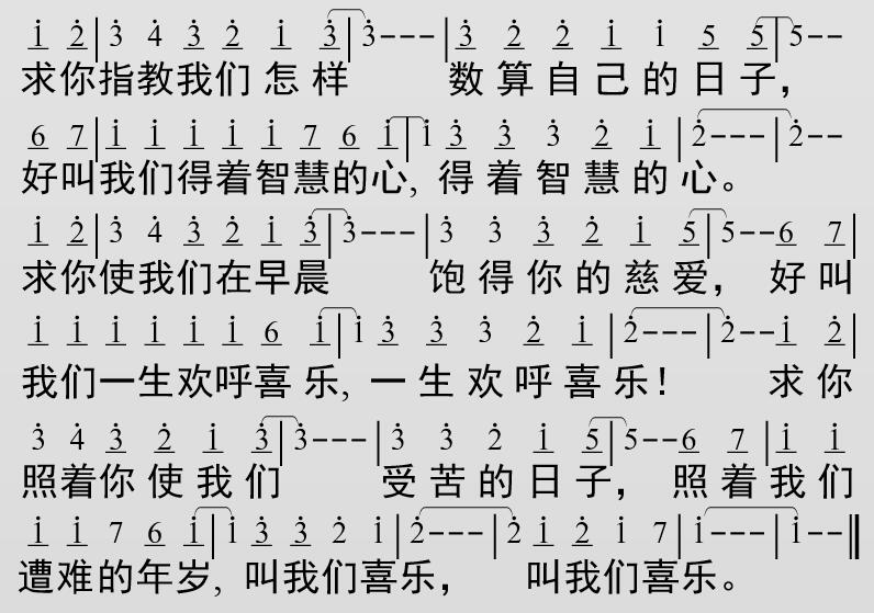 你将我们的罪孽摆在你面前,将我们隐藏的罪摆在你面光之中。我们经过的日子,都在你盛怒之中;我们度尽的年岁,好像一声叹息。我们一生的年日是七十岁,若是强壮可到八十岁;但其中所矜夸,不过是劳苦愁烦,转眼成空,我们便如飞而去。求你指教我们怎样数算自己的日子,好叫我们得着智慧的心,得着智慧的心。求你使我们在早晨饱得你的慈爱,好叫我们一生欢呼喜乐,一生欢呼喜乐!求你照着你使我们受苦的日子,照着我们遭难的年岁,叫我们喜乐,叫我们喜乐!
