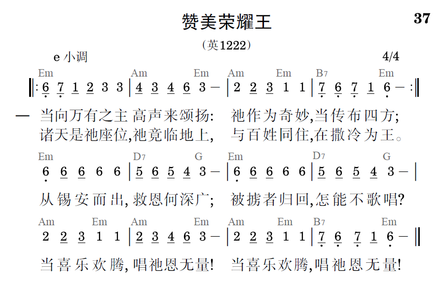当向万有之主高声来颂扬:祂作为奇妙,当传布四方;诸天是祂座位,祖竟临地上,与百姓同住,在撒冷为王。从锡安而出,救恩何深广;被掳者归回,怎能不歌唱?当喜乐欢腾,唱祂恩无量!当喜乐欢腾,唱祂恩无量!