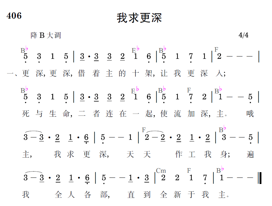 更深,更深,借着主的十架,让我更深入;死与生命,二者连在一起,使流加深,主。哦主,我求更深,天天作工我身;遍我全人各部,直到全新于我主。