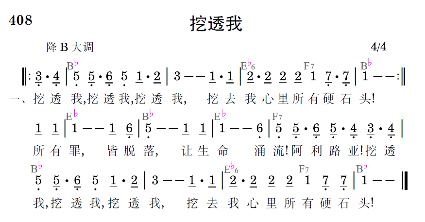 挖透我,挖透我,挖透我,挖去我心里所有硬石头!所有罪,皆脱落,让生命涌流!阿利路亚!挖透我,挖透我,挖透我,挖去我心里所有硬石头!