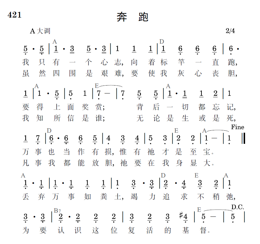 我只有一个心志,向着标竿一直跑,要得上面奖赏;背后一切都忘记,万事也当作有损,唯有祂才是至宝。丢弃万事如粪土,竭力追求不稍弛,为要认识这位复活的基督。虽然四围是艰难,要使我灰心丧胆,我知所信是谁;无论是生或是死,凡事我都能放胆,祂要在我身显大。