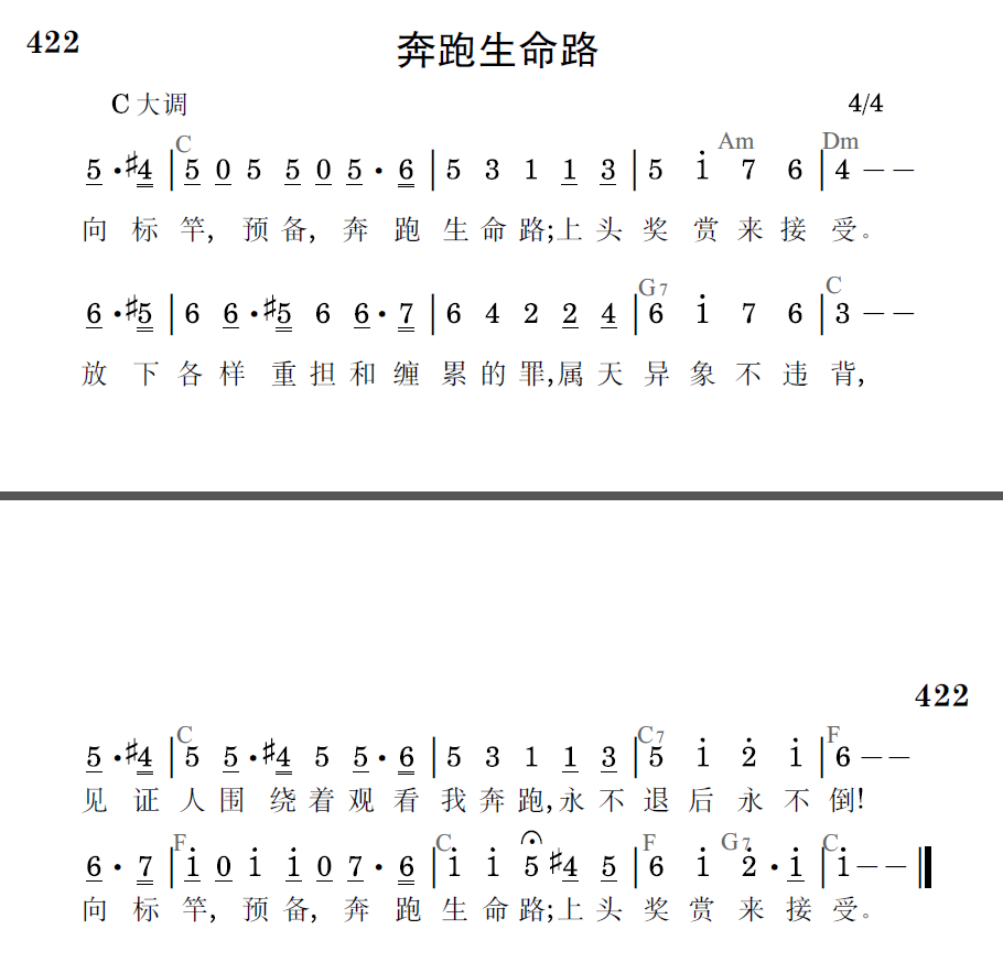 向标竿,预备,奔跑生命路;上头奖赏来接受。放下各样重担和缠累的罪,属天异象不违背,见证人围绕着观看我奔跑,永不退后永不倒!向标竿,预备,奔跑生命路;上头奖赏来接受。