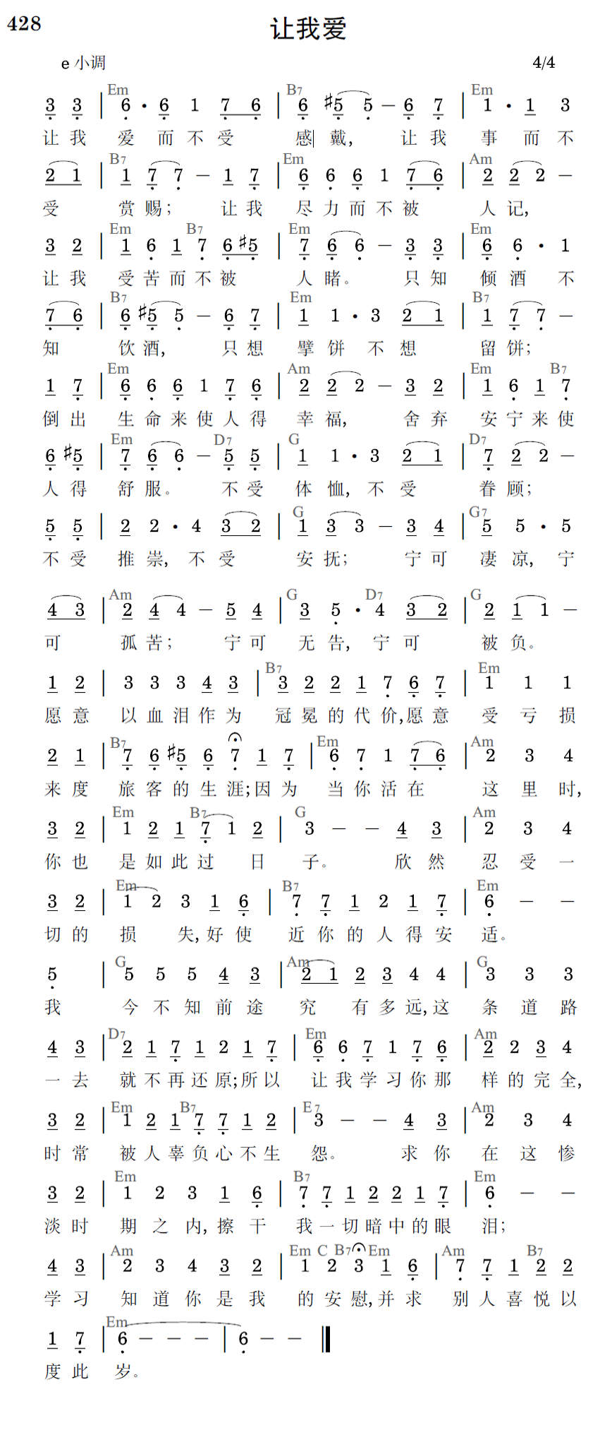 让我爱而不受感戴,让我事而不受赏赐;让我尽力而不被人记,让我受苦而不被人睹。只知倾酒不知饮酒,只想擘饼不想留饼;倒出生命来使人得幸福,舍弃安宁来使人得舒服。不受体恤,不受眷顾;不受推崇,不受安抚;宁可凄凉,宁可孤苦;宁可无告,宁可被负。愿意以血泪作为冠冕的代价,愿意受亏损来度旅客的生涯;因为当你活在这里时,你也是如此过日子。欣然忍受一切的损失,好使近你的人得安适。我今不知前途究竟有多远,这条道路一去就不再还原;所以让我学习你那样的完全,时常被人辜负心不生怨。求你在这惨淡时期之内,擦干我一切暗中的眼泪。学习知道你是我的安慰,并求别人喜悦以度此岁。