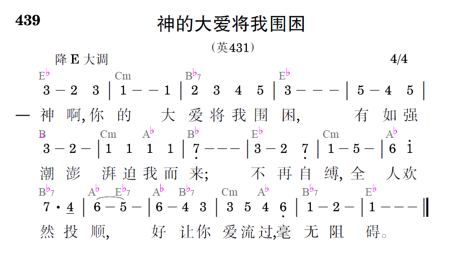 神啊,你的大爱将我围困,有如强潮澎湃迫我而来;不再自缚,全人欢然投顺,好让你爱流过,毫无阻碍。