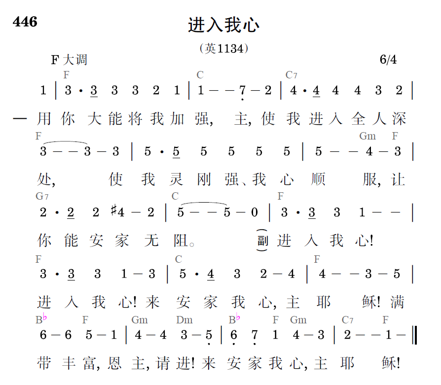 进入我心!进入我心!来安家我心,主耶稣!满带丰富,恩主,请进!来安家我心,主耶稣!