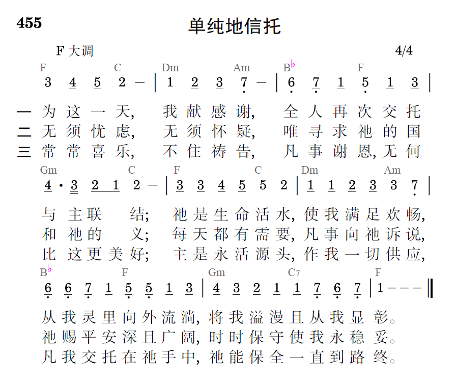 无须忧虑,无须怀疑,唯寻求祂的国和祂的义;每天都有需要,凡事向祂述说,祂赐平安深且广阔,时时保守使我永稳妥。