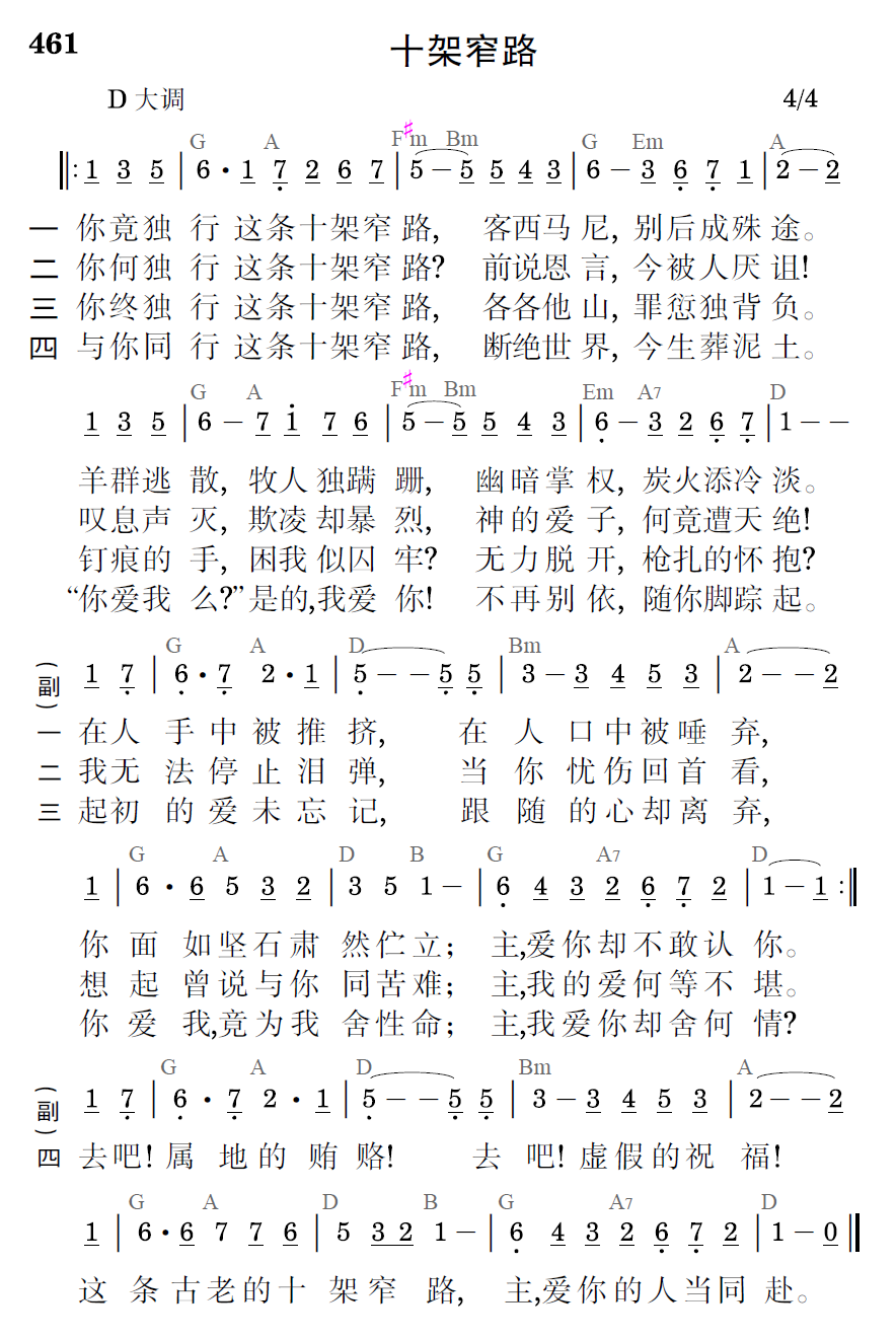 你何独行这条十架窄路?前说恩言,今被人厌诅!叹息声灭,欺凌却暴烈,神的爱子,何竟遭天绝!