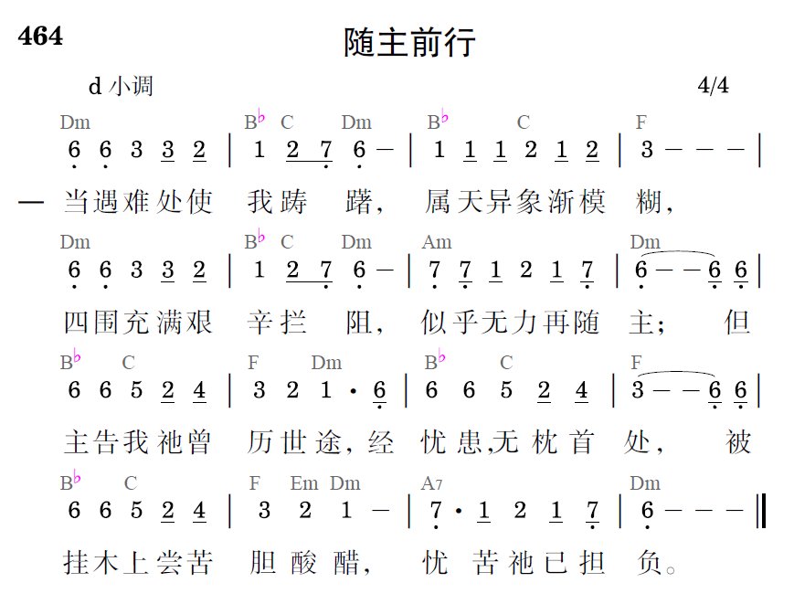 灵中听主提醒嘱咐,需要凭信走窄路;祂的患难要我补足,经历十架学顺服。祂话内住,时将我鼓舞,使我得力再举步,欢然随主历短暂苦楚,永远荣耀在目。