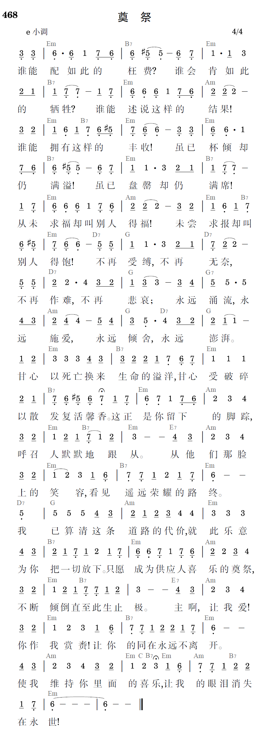 谁能配得如此的枉费?谁会肯如此的牺牲?谁能述说这样的结果!谁能拥有这样的丰收!虽已杯倾却仍满溢!虽已盘罄却仍满席!从未求福却叫别人得福!未尝求报却叫别人得饱!不再受缚,不再无奈,不再作难,不再悲哀;永远涌流,永远施爱,永远倾舍,永远澎湃。甘心以死亡换来生命的溢洋,甘心受破碎以散发发复活馨香。这正是你留下的脚踪,呼召人默默的跟从。从他们那脸上的笑容,看见遥远荣耀的路终。我已算清这条道路的代价,就此乐意为你把一切放下。只愿成为供人喜乐的奠祭,不断倾倒直至此生止极。主啊,让我爱!求你做我赏莱!让你的同在永远不离开。使我维持里面的喜乐,让我的眼泪消失在永世。