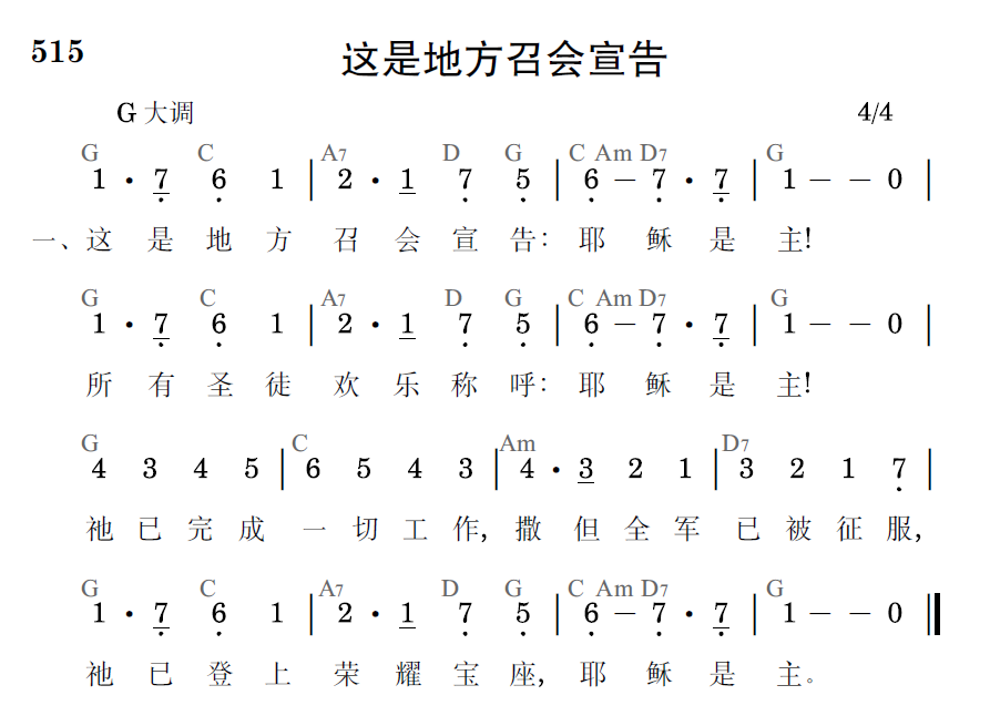 这是地方召会宣告:耶稣是主!所有圣徒欢乐称呼:耶稣是主!祂已完成一切工作,撒但全军已被征服,祂已登上荣耀宝座,耶稣是主。